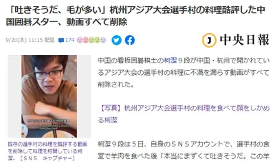 【杭州アジア大会選手村】中国スター選手がSNS投稿「料理が不味すぎる、吐きそうだ、毛が多い」→シェアしたものも全て消された模様→再登場「料理おいしい料理さいこう」