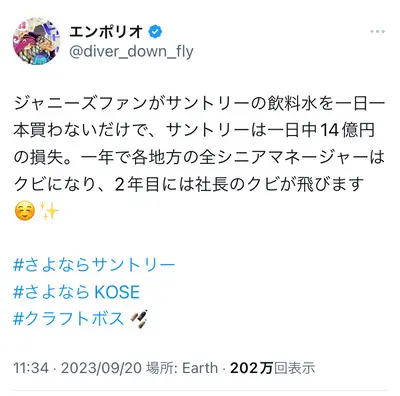 【悲報】サントリーさん、ジャニオタの不買運動で1日14億円の損失で終わる