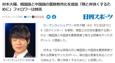 ウーマン村本、教育提案「隣国交流重視すべき、英語の次に韓国語と中国語を義務教育で教える授業をやった方がいい」