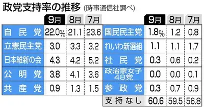 【速報】政党支持率 日本維新4.3% 立憲民主党3.0% 共産党0.9% れいわ1.1%