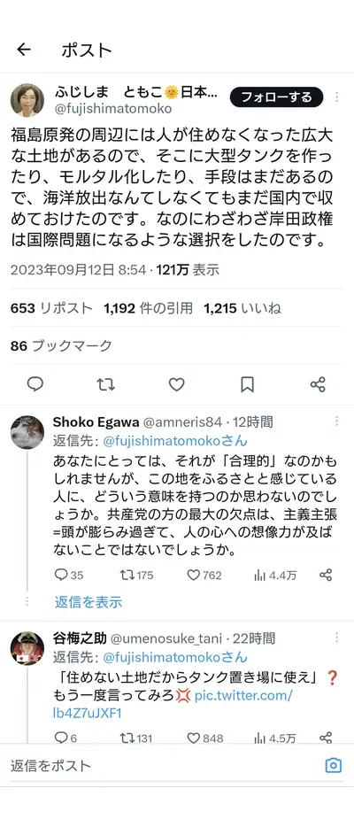 日本共産党「福島の住めなくなった広大な土地に汚染水タンク作ればいいじゃん」→炎上も追加「国際問題になる放出はそれよりいいのでしょうか?」