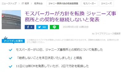 【速報】モスバーガー、2日前には新CM発表も「人権方針の考え方に反する、ジャニーズ事務所との契約終了を決定いたしました」