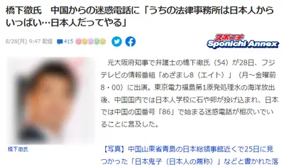 【悲報】橋下徹氏 中国電凸に「日本人だってやる。うちの法律事務所は日本人からいっぱい」