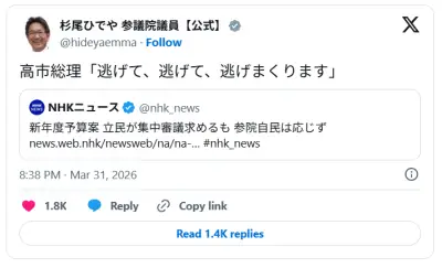 【もちろん炎上】立憲・杉尾氏、Xにて「(高市早苗首相について)逃げて、逃げて、逃げまくります」 国民「こういうので票を失ってる」「人としてどうなの?」