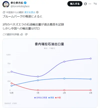 【速報】3月のベネズエラの石油輸出過去最高、しかし中国への輸出量はゼロ「トランプ大統領の本当の目的はこれだということはデータで出た」と話題