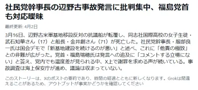 【他責の極致】社民幹事長・服部氏「新基地建設を続けるのが悪い」発言に福島氏ダンマリ「コメントする立場にない」