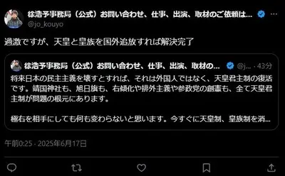熱海市長選出馬の徐浩予氏「中国人差別や排外主義を根絶するため天皇を日本国外に追放するべき」