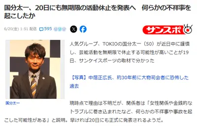 【速報】TOKIO国分太一、全番組降板で無期限活動中止・退社も「なんらかの不祥事か」