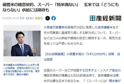 小泉「備蓄米5キロ2000円!」 産経「どうせ転売ヤーに荒らされて終わりやろ」