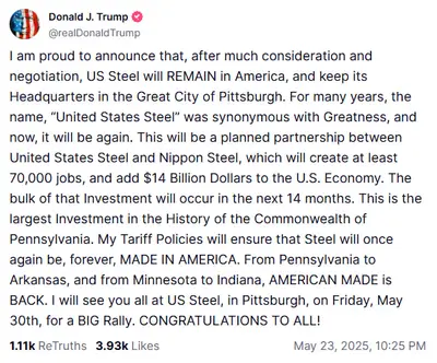 【悲報】トランプ「日鉄のUSスチール買収バリいいやん👍承認!🆗」