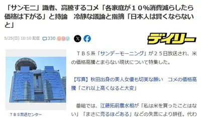 【悲報】サンモニ「米、米、米って言ってる日本人は賢くならないと、10%、各家庭が米の消費減らしたら一気に米の価格なんて落ちていきますよ」
