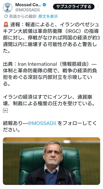 【速報】イランのペゼシュキアン大統領「革命防衛隊よ停戦しろ!もうイランは3週間も保たんぞ」コントロール不可能な内ゲバ状態に陥っている可能性