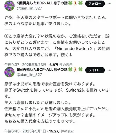 【削除された原文入手】親「息子が余命宣告を受けました、落選したので優先購入権をお願いしたら冷たい返信があった」→この親、中国人では?と話題
