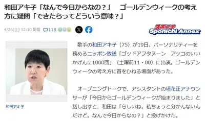 【悲報】和田アキ子「なんで今日からなの?」 ゴールデンウィークの考え方に疑問「休みにできたらってどういう意味?」