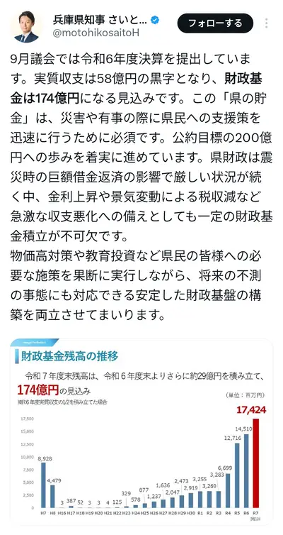 【パヨ悲報】兵庫県、斎藤知事の元でみるみる財政を改善させる 財政基金は10年前の10倍を突破