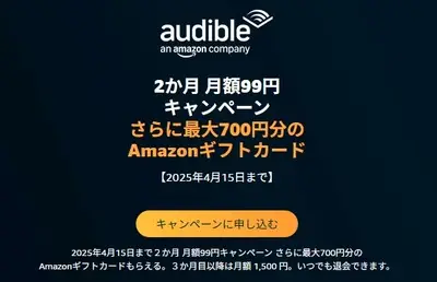 【残り1時間】Amazon公式「Audible2ヶ月99円に登録で500円分ギフトカードあげるわ」利用者「もっと早く知りたかった、どうせ登録するなら貰っとけ」