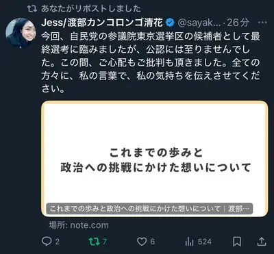 【速報】自民党、渡部カンコロンゴ清花氏を公認しないことを決定
