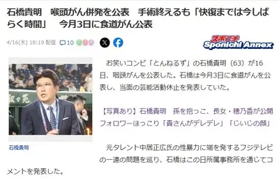 【速報】とんねるず石橋貴明、癌転移と手術を発表「報道に関しては術後に報道で知り、叶うのであれば直接謝罪させていただきたく思います」