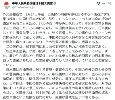 【速報】中国大使館、自衛隊侵入事件で激烈抗議声明を発表