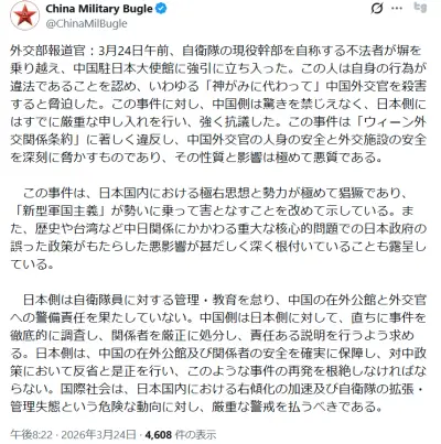 【速報】中国外務省、例の事件をいいことに土足で踏み込み堂々内政干渉開始「自衛隊員の管理や教育が不十分」「事件の徹底捜査を」