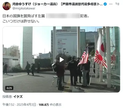 【動画】某新聞の記者、偶然を装い「日本の国旗を蹴飛ばす」も定点カメラで故意の証拠がばっちり映る