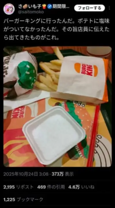 【悲報】バーガーキングさん、「ポテトに塩付いてないんだけど」と指摘した客にとんでもない嫌がらせをするwwwww