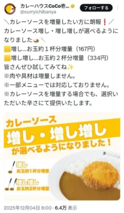 【悲報】CoCo壱「カレーソースのマシとマシマシが出来るようになりました!!」←批判殺到wwwww