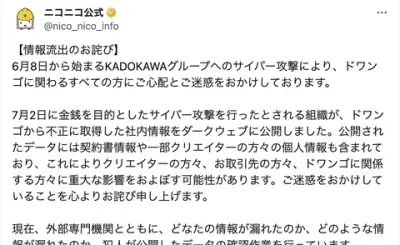 【悲報】KADOKAWA、認める「N中・N高・S高生徒の個人情報などが漏洩した可能性が高い」