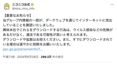 【悲報】ニコニコ公式「ダークウェブに情報流出していますが、絶対にダウンロードなどしないでください」