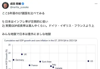 成田悠輔「日本はG7諸国と比べてインフレ率が圧倒的に低い。実質GDP成長率は真ん中くらい。意外にましな地獄」