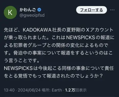 【悲報】川上量生「NewsPicksが報じたせいで夏野さんのXアカウントが乗っ取られました。どう責任とるの?」