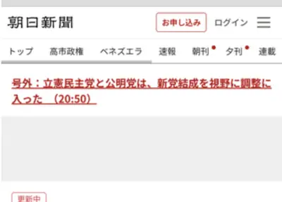 【朝日新聞号外】立憲民主党と公明党、新党結成へ。政権交代くるううううう