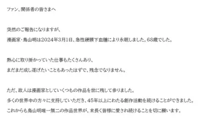 【訃報】漫画家の鳥山明さん、急性硬膜下血腫のため68歳で死去