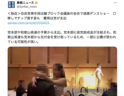 【悲報】自民党青年局、会合でエロダンスショー。口移しでチップ渡し、費用は党が支出