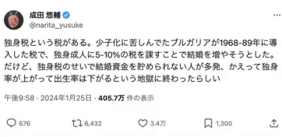 成田悠輔「独身税を導入したブルガリアは結婚資金を貯められない人が多発、かえって独身率が上がって出生率は下がるという地獄に終わった」