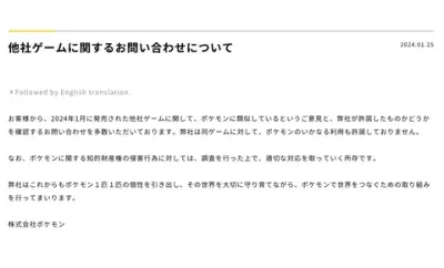 【速報】株式会社ポケモン、パルワールドにお気持ち表明「ポケモンのいかなる利用も許諾しておりません」