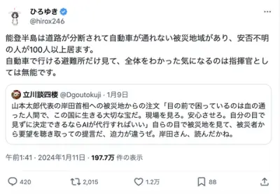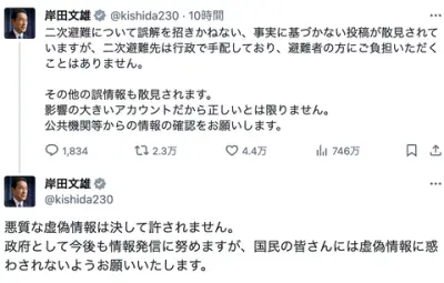 岸田首相「2次避難先は行政で手配してるから負担なし。悪質な虚偽情報は許されない。影響の大きいアカウントだから正しいとは限らない」