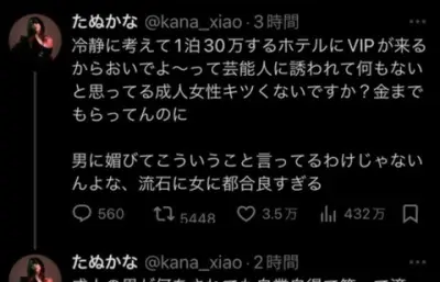 たぬかな「1泊30万円もするホテルのVIP部屋に誘われて、何もないと思ってる女がおかしくない?」