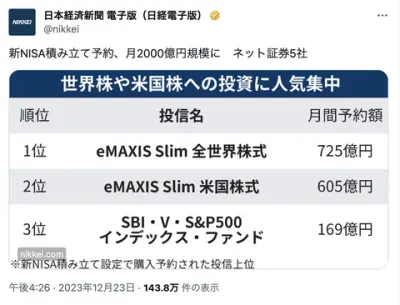 【悲報】証券会社「新NISA開始で月2000億円以上オルカンやS&P500が買われる見込みです」