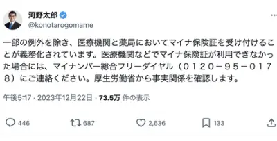 河野大臣「医療機関に紙の保険証をと言われたらフリーダイヤルで国に連絡を」マイナ保険証の利用率4.5%なのに…