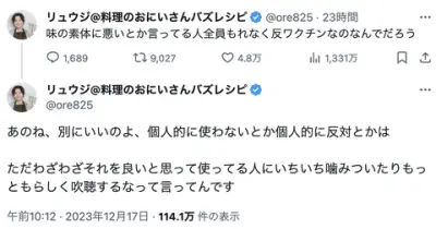 料理研究家リュウジさん「うま味調味料反対派はマジでなにが体に悪いのかちゃんと説明してほしいんだよな」