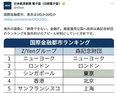 【悲報】国際金融ランキング「東京は20位」日本政府「納得できない。東京は世界3大金融都市だ」