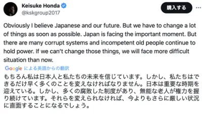 本田圭佑「日本は今、多くの腐敗したシステムや無能な老人が権力を握り続けている。それらを変えないと今より厳しい状況に直面する」