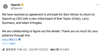 【朗報】サム・アルトマン氏、OpenAIのCEOに復帰へ