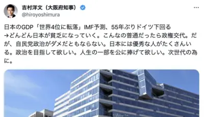 吉村知事、GDP世界4位転落の報道受け自民党を批判「どんどん日本が貧乏になっていく。こんなの普通だったら政権交代」