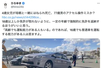ひろゆき、77歳運転の車にはねられ4歳女児死亡に「一定の年齢で強制的に免許を返納するほうがいいと思う」