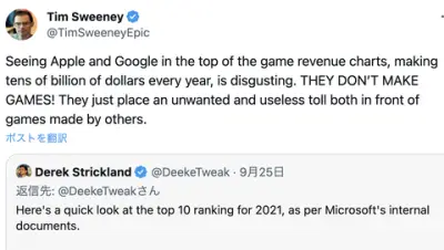 【悲報】Epic「GoogleとAppleはゲーム作らないくせにみかじめ料で大儲けしている。おぞましい」
