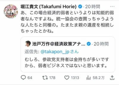 【悲報】ホリエモン「参政党支持してる人は知能的弱者。統一教会の壺買っちゃうような人たちと同種」