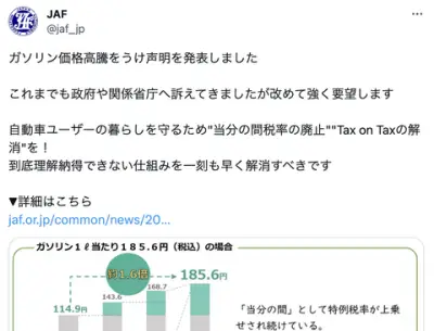 ガソリン価格高騰を受けJAFが声明「自動車ユーザーの暮らしを守るため『当分の間税率の廃止』と『二重課税の解消』を求める」
