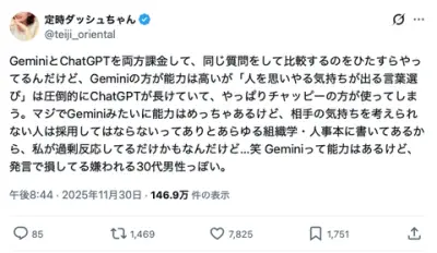 女性ユーザー「Geminiって能力はあるけど発言で損してる嫌われる30代男性っぽい」